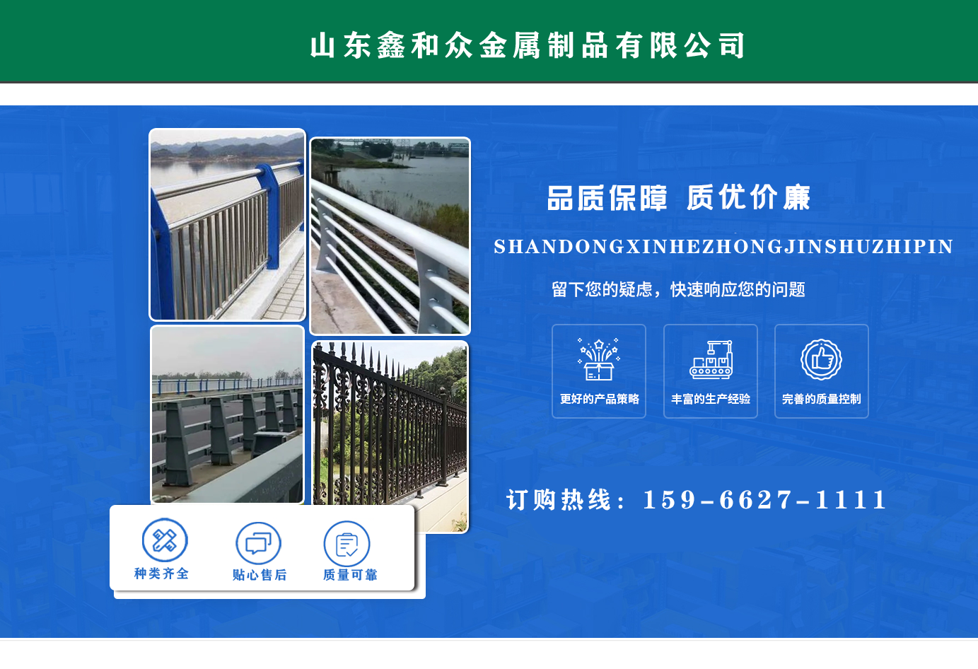 山東鑫和眾金屬制品有限公司主要產(chǎn)品有防撞護(hù)欄,橋梁護(hù)欄,道路護(hù)欄,河道護(hù)欄,不銹鋼護(hù)欄等護(hù)欄。提供設(shè)計方案,一站式定制,包您滿意價格優(yōu)惠,歡迎來電咨詢! 公司常年從事銷售護(hù)欄防撞護(hù)欄,橋梁護(hù)欄,道路護(hù)欄,河道護(hù)欄,不銹鋼護(hù)欄,橋梁鋼護(hù)欄,河道燈光護(hù)欄等。產(chǎn)品廣泛應(yīng)用于橋梁、河道、旅游景區(qū)、道路、公路、公園、小區(qū)、景觀、道路防撞等領(lǐng)域。 公司產(chǎn)品均采用優(yōu)質(zhì)不銹鋼材料,符合相關(guān)標(biāo)準(zhǔn)。各種型號不銹鋼復(fù)合管及護(hù)欄,質(zhì)量嚴(yán)格把控。產(chǎn)品強度高、耐腐蝕、焊接牢固、抗沖擊、性能好,防撞護(hù)欄結(jié)構(gòu)簡單、美觀實用大方?! g迎前來訂購!...